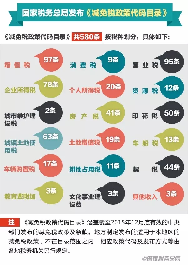 新版《減免稅政策代碼目錄》(以下簡(jiǎn)稱《代碼目錄》)包括580條,涉及增值稅、消費(fèi)稅、營(yíng)業(yè)稅、企業(yè)所得稅、個(gè)人所得稅、資源稅、房產(chǎn)稅、城市維護(hù)建設(shè)稅、印花稅、契稅、城鎮(zhèn)土地使用稅、土地增值稅、車船稅、車輛購(gòu)置稅、耕地占用稅、教育費(fèi)附加和文化事業(yè)建設(shè)費(fèi)等。