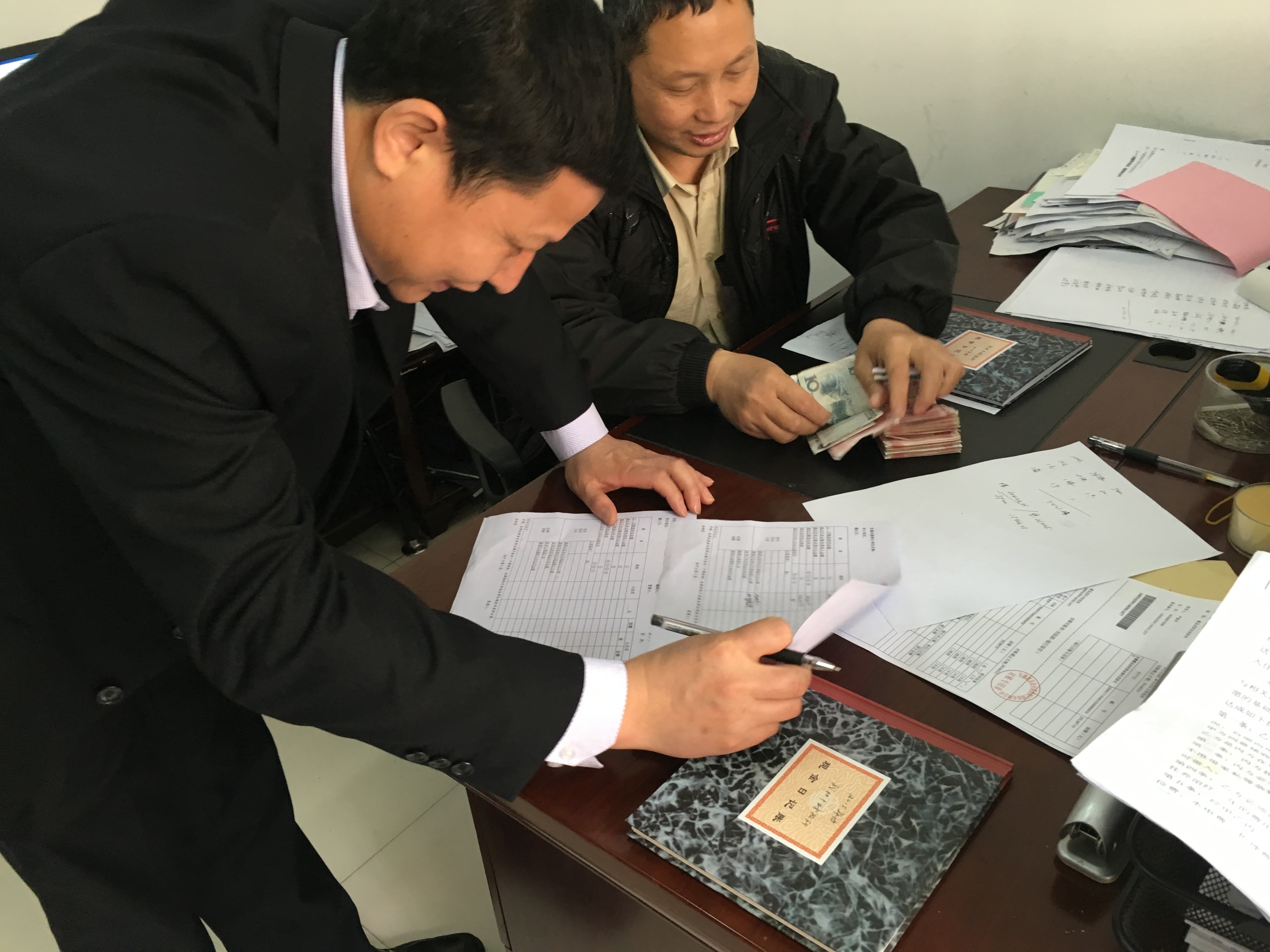 △審計(jì)組人員進(jìn)行現(xiàn)金監(jiān)盤(pán)(左為審計(jì)組人員,右出納吳夢(mèng)華)