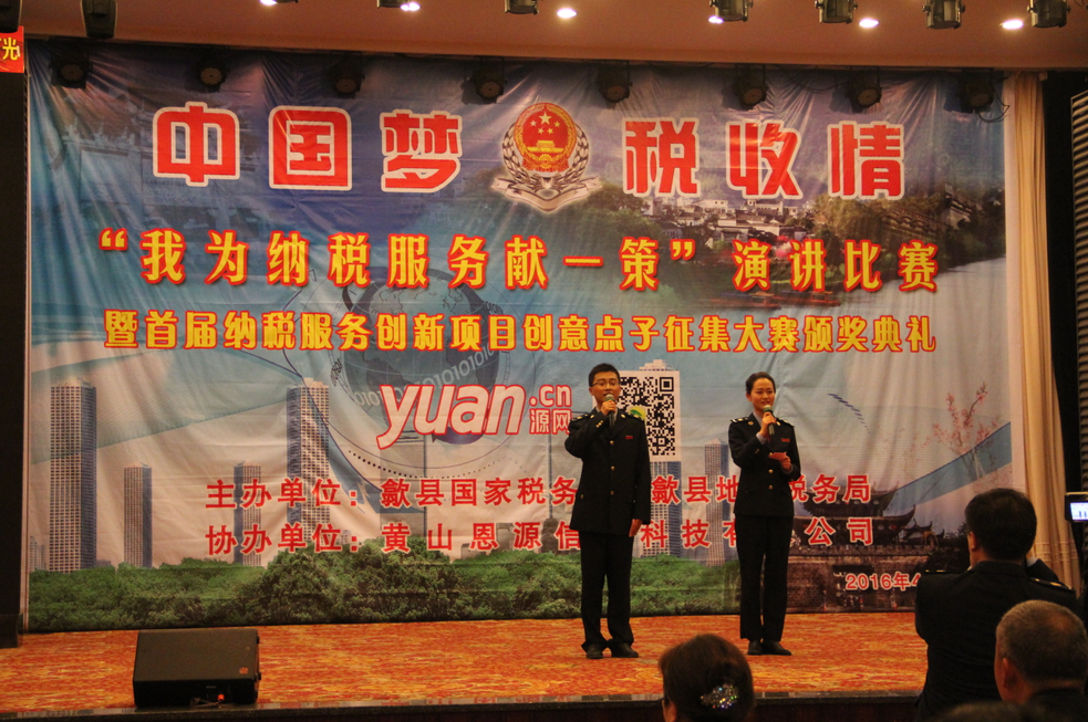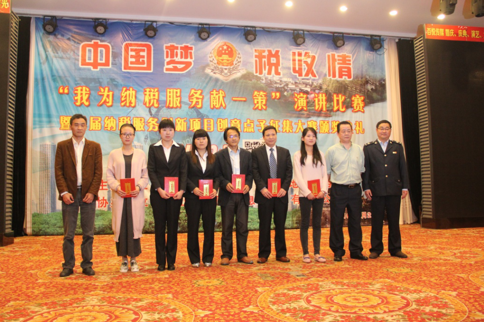 2016年4月22日,由歙縣國(guó)、地稅局主辦的《“我為納稅服務(wù)獻(xiàn)一策”演講比賽 暨首屆納稅服務(wù)創(chuàng)新項(xiàng)目創(chuàng)意點(diǎn)子征集大賽頒獎(jiǎng)典禮》在歙縣飯店隆重召開(kāi)。我公司參加演講員工童群和“納稅服務(wù)”參賽獲獎(jiǎng)8名員工參加了此次活動(dòng)。