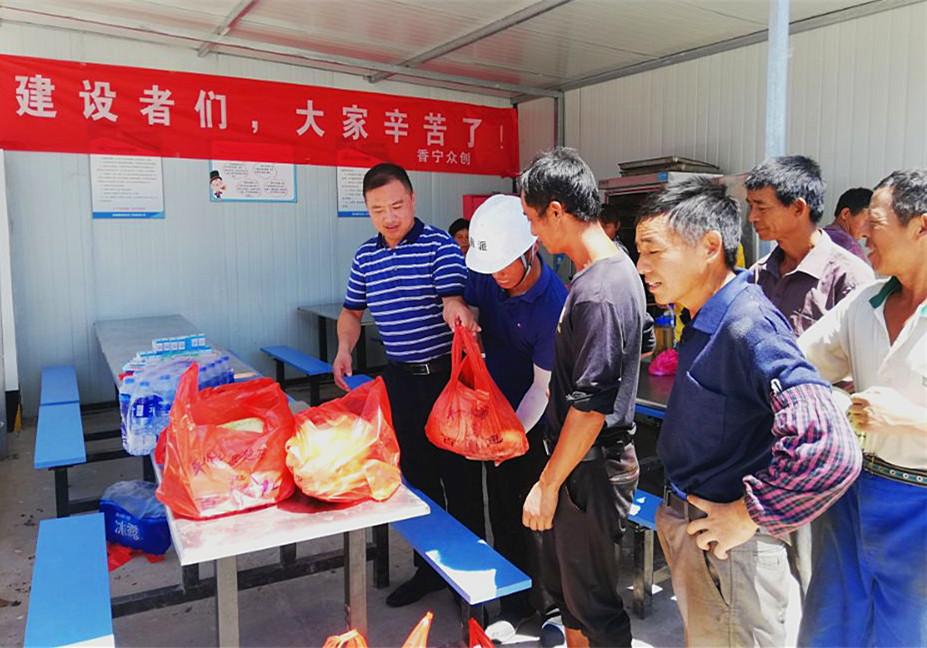8月2日,中心主任胡海鋒來到香寧科技創(chuàng)業(yè)服務中心暨歙縣退役軍人創(chuàng)業(yè)孵化和就業(yè)促進基地項目建筑工地,對冒高溫、戰(zhàn)酷暑的建設工友進行親切慰問。胡海鋒主任將西瓜、礦泉水和解暑藥等慰問品分發(fā)到建設者手中,并感謝大家的辛勤付出,同時叮囑大家一定要注意防暑降溫,確保安全生產(chǎn)。