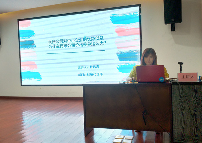 杜思惠轉(zhuǎn)正時間不長,但她工作努力、學(xué)習(xí)認真,已經(jīng)成為部門經(jīng)理的得力助手。當(dāng)日,她結(jié)合日常學(xué)習(xí)到的點滴,以權(quán)敢勞務(wù)公司財稅代理簽約入題,從注冊公司找代理記賬公司代辦的好處,代理記賬公司對中小企業(yè)的優(yōu)勢,代記賬公司的價格差異為什么這么大等三個方面展開闡述,使參訓(xùn)人員受益良多。中心副主任汪銘進行了點評,他肯定了杜思惠的選題和內(nèi)容組織,號召大家善于從日常工作、學(xué)習(xí)中積累素材,為PPT分享做好準(zhǔn)備,不斷提升中心的對外服務(wù)水平。