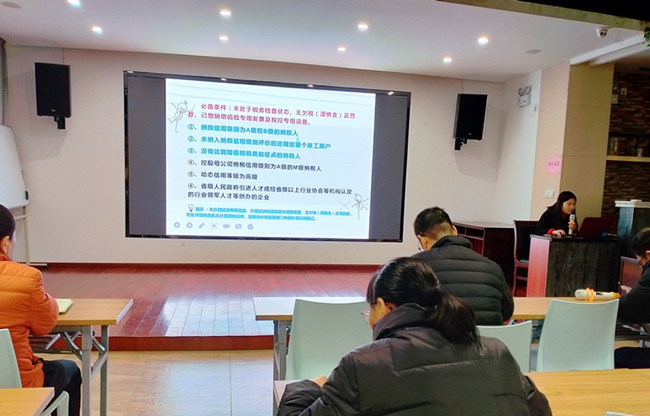 2021年12月4日,由歙縣招商投資服務(wù)中心主辦,黃山市金信財稅代理事務(wù)所有限公司承辦,金信公司點(diǎn)單財稅部初級會計師——謝姝主講的“稅務(wù)簡易注銷網(wǎng)上辦理操作流程”專題培訓(xùn)在一樓眾創(chuàng)空間舉行,園區(qū)企業(yè)負(fù)責(zé)人和中心財稅服務(wù)人員50余人參與此次分享。