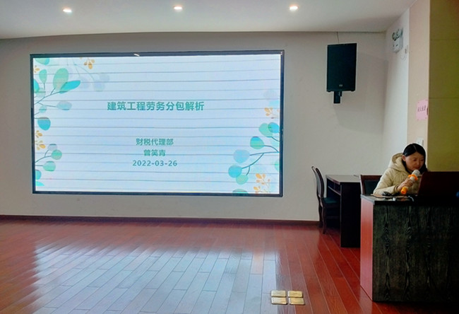 2022年3月26日,由歙縣招商投資服務(wù)中心主辦,黃山市金信財稅代理事務(wù)所有限公司承辦,財稅代理部副經(jīng)理曾笑青主講的“建筑工程勞務(wù)分包”專題培訓在一樓眾創(chuàng)空間舉行,園區(qū)企業(yè)負責人和中心財稅服務(wù)人員40余人參與此次分享。