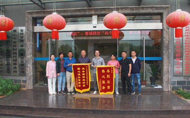 2023年6月6日,黃山市百慶交通設(shè)施有限公司李總經(jīng)理將繡有“業(yè)務(wù)精湛效率高,貼心服務(wù)素質(zhì)好”字樣的錦旗送到我金信咨詢(黃山)集團(tuán)有限公司總經(jīng)理胡海鋒手中,感謝我金信集團(tuán)多年來在雙方合作中給予的大力支持和幫助。并向財稅代理經(jīng)理楊鳳琴贈送一面“盡職盡責(zé)、熱心服務(wù)”的個人錦旗,表達(dá)對楊鳳琴經(jīng)理的感謝之情。