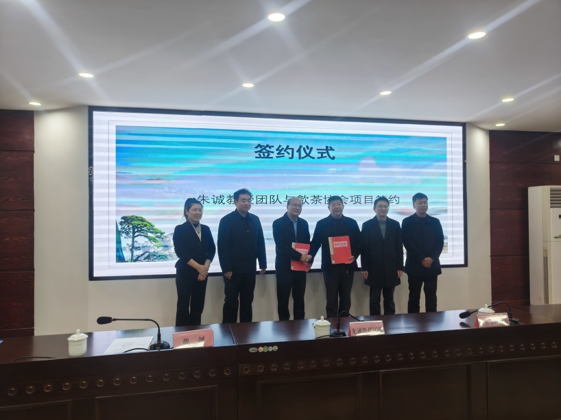 歙縣茶葉協(xié)會與中國計(jì)量大學(xué)朱誠科研團(tuán)隊(duì)達(dá)成合作意向,黃劍等共同見證簽約儀式。